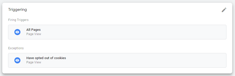 If we create an exception trigger, related to our website visitors opting out of cookies, we can then block off all other triggers – therefore remove all other cookies and tracking pixels.