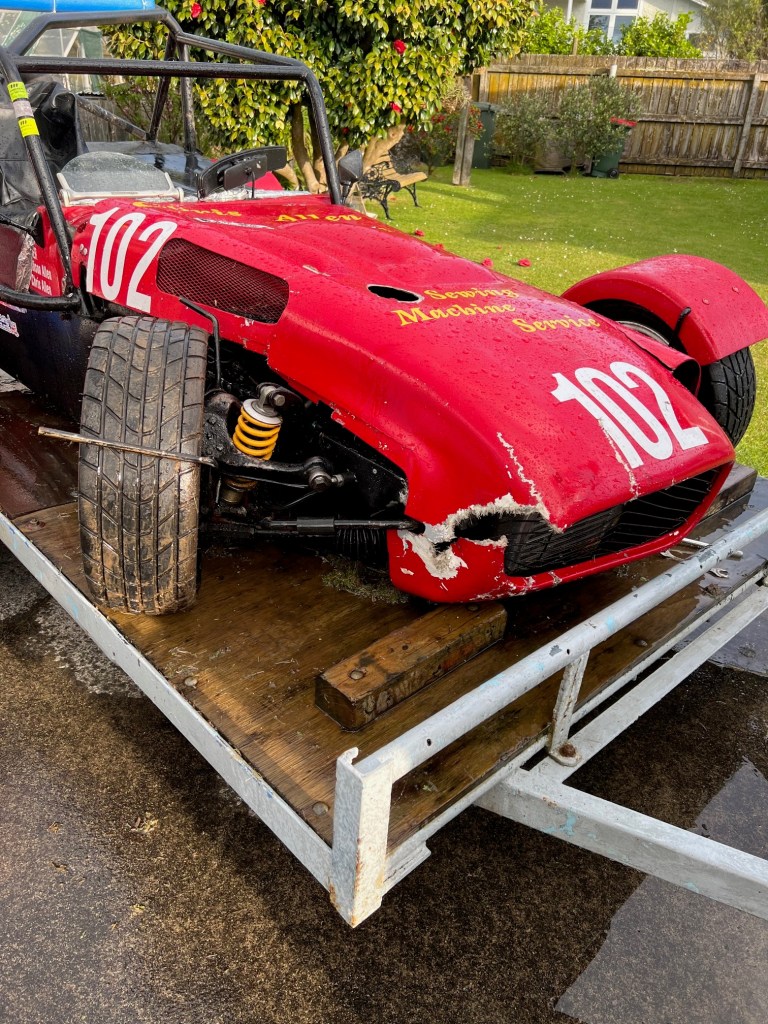 At 78 years young, dad’s desire to race is still much very alive BUT a slight mishap 4 months ago at Manfeild has left the car missing a limb and a 2โ twist in the chassis.